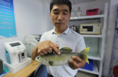 在實驗室里,青島海星儀器有限公司創始人張躍鋒正在擺弄著一個塑膠做的魚,魚體上還插著一根藍色小針??蓜e小瞧了這根藍色小針,這就是張躍鋒與伙伴們花了大半年的時間研發出的新技術。張躍鋒向記者介紹,這個小玩意叫做魚類追蹤器,將這個東西放在魚身上,通過衛星等就可以做到數據傳輸,能夠實時地監控到魚的現狀。對于研究魚類的遷徙、生活習性、養殖等都有非常大的幫助。這個產品目前已經賣給了清華等多所大學和知名的海洋研究所。