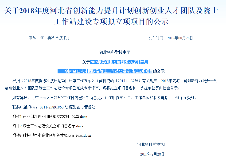 近日,河北省科學技術廳根據《2018年度省級科技計劃項目評審工作方案》(冀科資函〔2017〕132號)有關規定,2018年度河北省創新能力提升計劃創新創業人才團隊及院士工作站建設專項已完成專家評審,公示的科技型中小企業創新英才擬認定名單中園區企業邯鄲元一無人機科技有限公司王啟源和河北唯沃環境工程科技有限公司康天嘯、李陽、喬永才、劉濤等榜上有名。